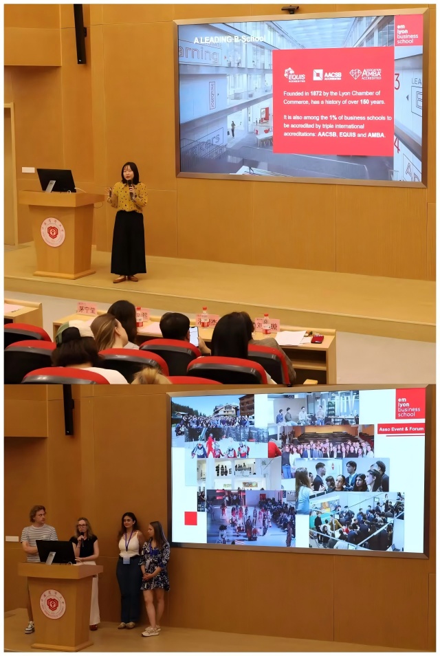 里昂商学院亚洲高级招生经理陈琛详细介绍了健康产业创新与数据科学硕士项目,里昂商学院学生代表RYSER Emma 、VOISIN Gwladys 、DENNAOUI Diane和COMPÈRE Arthur分享了在里昂商学院的学习经历与文化体验,引起了在场学生的浓厚兴趣。最后的问答环节中,双方围绕课程设置、实习机会、语言要求等话题展开热烈讨论,现场互动频繁,气氛活跃。