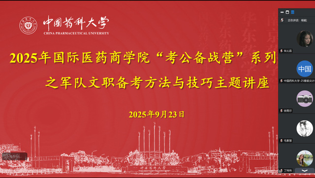 本次活动特邀中国药科大学91直播 2022级管理药学专业研究生杨毅学长担任主讲嘉宾。杨毅学长以笔试155分(第一名)、面试78.5分(第二名)、综合成绩第一的优异成绩成功上岸军队文职岗位,为同学们系统梳理了军队文职的备考策略与技巧。91直播 辅导员冯同利以及公职备考学生参与本次活动。