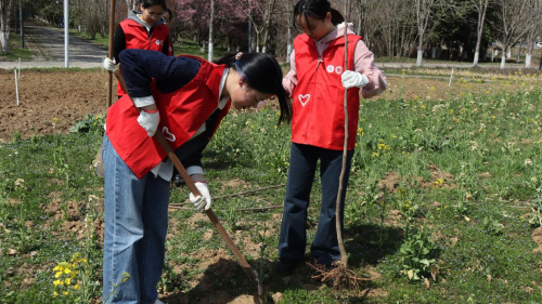 活动开始前,绿化养护单位专业师傅介绍了种植无花果树的方法和注意事项。活动现场,同学们热情高涨,两人一组通力合作,一人手扶树苗保持直立,一人手持铁锹培土。栽种完成后,同学们对新栽的树苗浇水,用“志愿红”播种“文明绿”,以实际行动为美丽校园建设贡献自己的一份力量。
