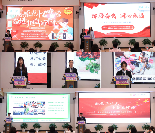 展示过程中,我校国际医药商学5支队伍分别以《继坚韧不拔之勇 创笃行不怠之功》《信仰点亮青春 笃行成就梦想》《青春向党沐风雨 杨帆追梦砥砺行》《初心原点忆峥嵘 担当奋进向未来》《踔厉奋发 同心致远》为题进行展示,东南大学吴健雄学院以《献礼二十大,青春在行动》为题、南京航空航天大学计算机科学与技术学院以《垃圾+创意=宝藏”改造计划》为题、河海大学大禹学院以《少年奋进无遗力,继往开来义不辞》为题进行分享。各支部立足青年视角,以微团课、手绘长卷、实践服务、视频创作、情景剧演绎、参观红色教育基地等丰富多彩的形式,生动阐述了新时代青年要发扬“功成不必在我、功成必定有我”的责任感和使命感,践行“请党放心,强国有我”的铮铮誓言和行动自觉,现场气氛热烈、掌声不断。